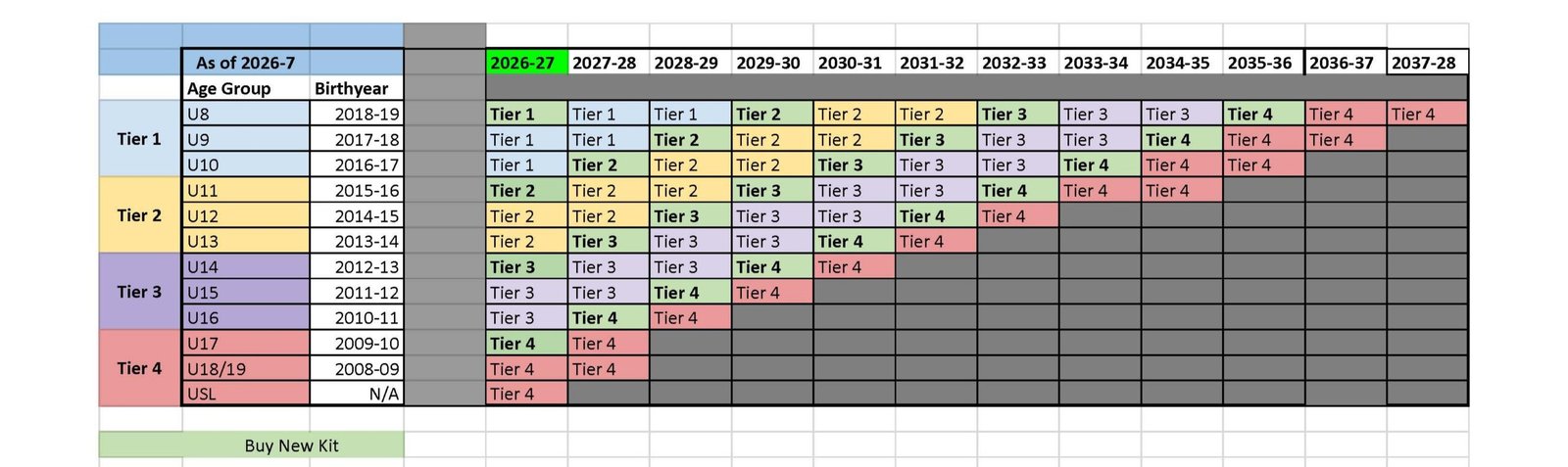 In a nutshell, the system works in three year tiers. When a player starts with the club, they arrive in a particular tier based upon their age. In known and regular periods, each three years, players cycle ‘up’ to new apparel. This timing was selected to correspond to normal wear-and-tear, players typical growth rate and for new sizing.